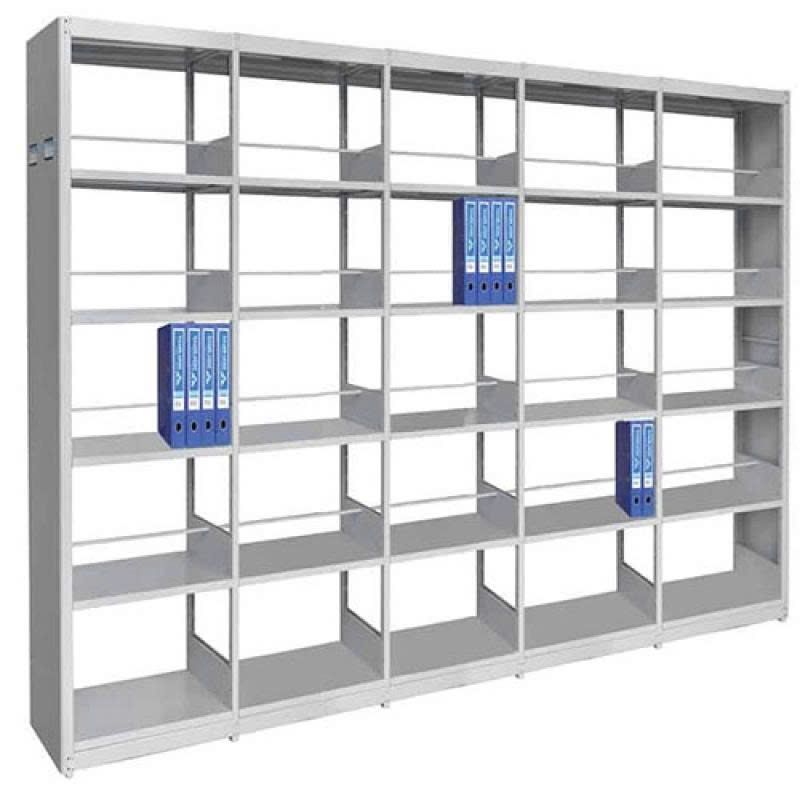 Giá thư viện 5 khoang sử dụng 2 mặt, có 5 tầng để tài liệu. Các đợt và thanh chắn có thể di động giúp điều chỉnh độ cao.